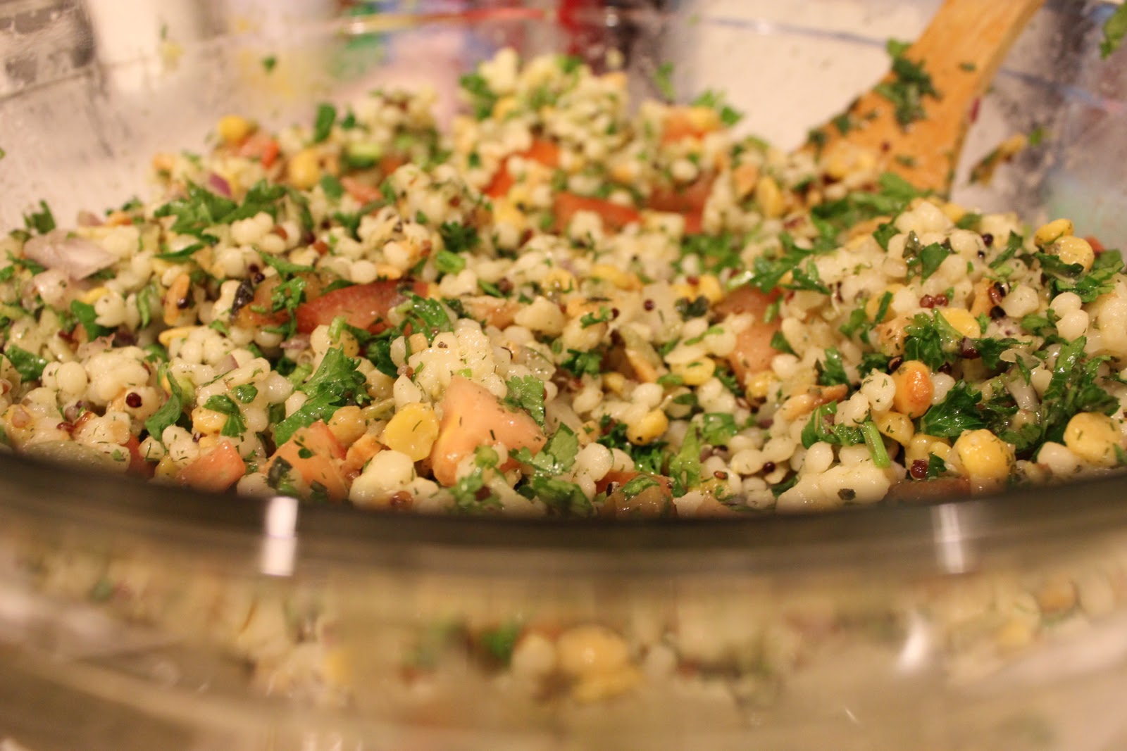 So, at home I had a bag of TJ's Harvest Mix. I think you could use a variety of small grains if you wanted to. What makes Tabbouleh delicious is all of the fresh herbs, vegetables, and flavors when the meld together. So healthy, light, and delicious. A great compliment to any chicken or lamb dish or even as a topper for your salad.